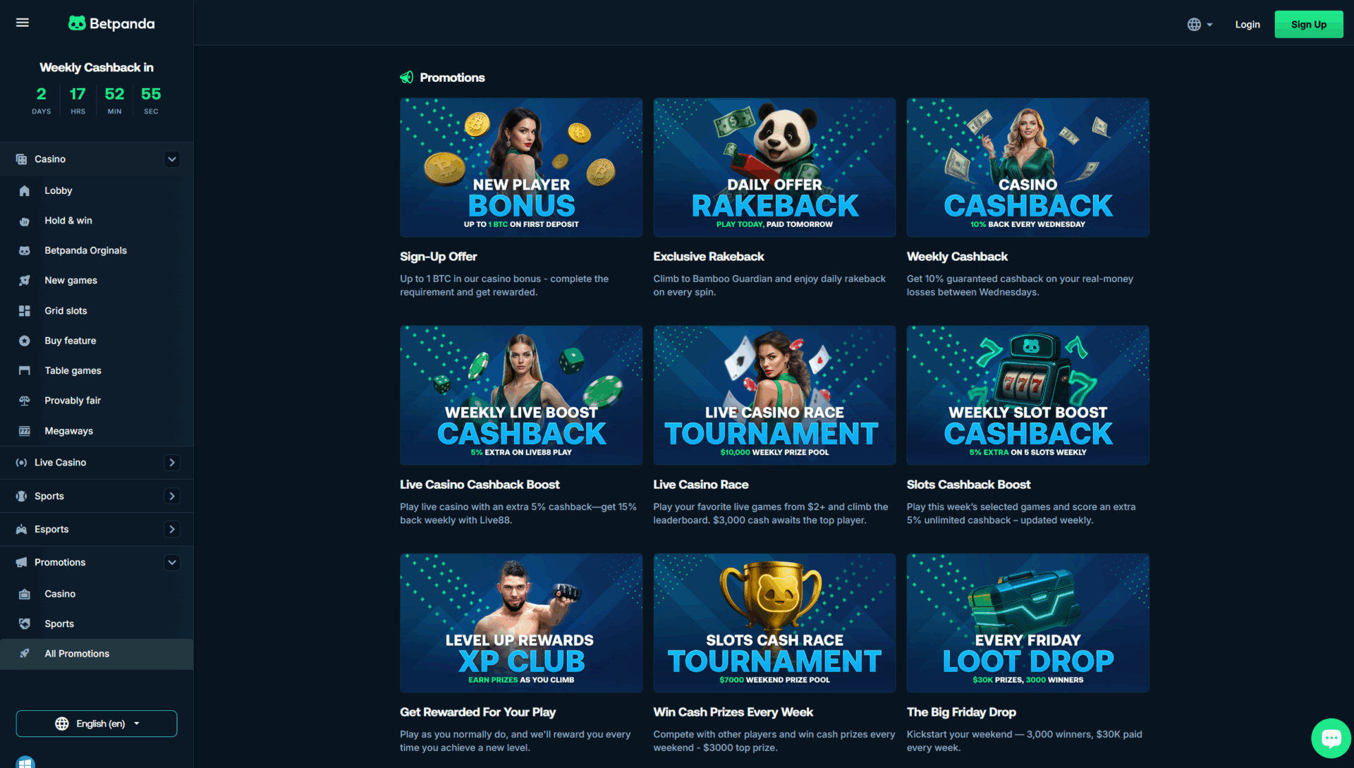Besides personalized rewards, the main reason you’ll want to enroll in the casino’s VIP program is 10% weekly cashback every Wednesday, guaranteed. The bonus unlocks at 12,500 XP (Panda Cub II) and requires at least 50 wagers from Wednesday to Wednesday. The bonus is instantly withdrawable, so no playthrough requirements.